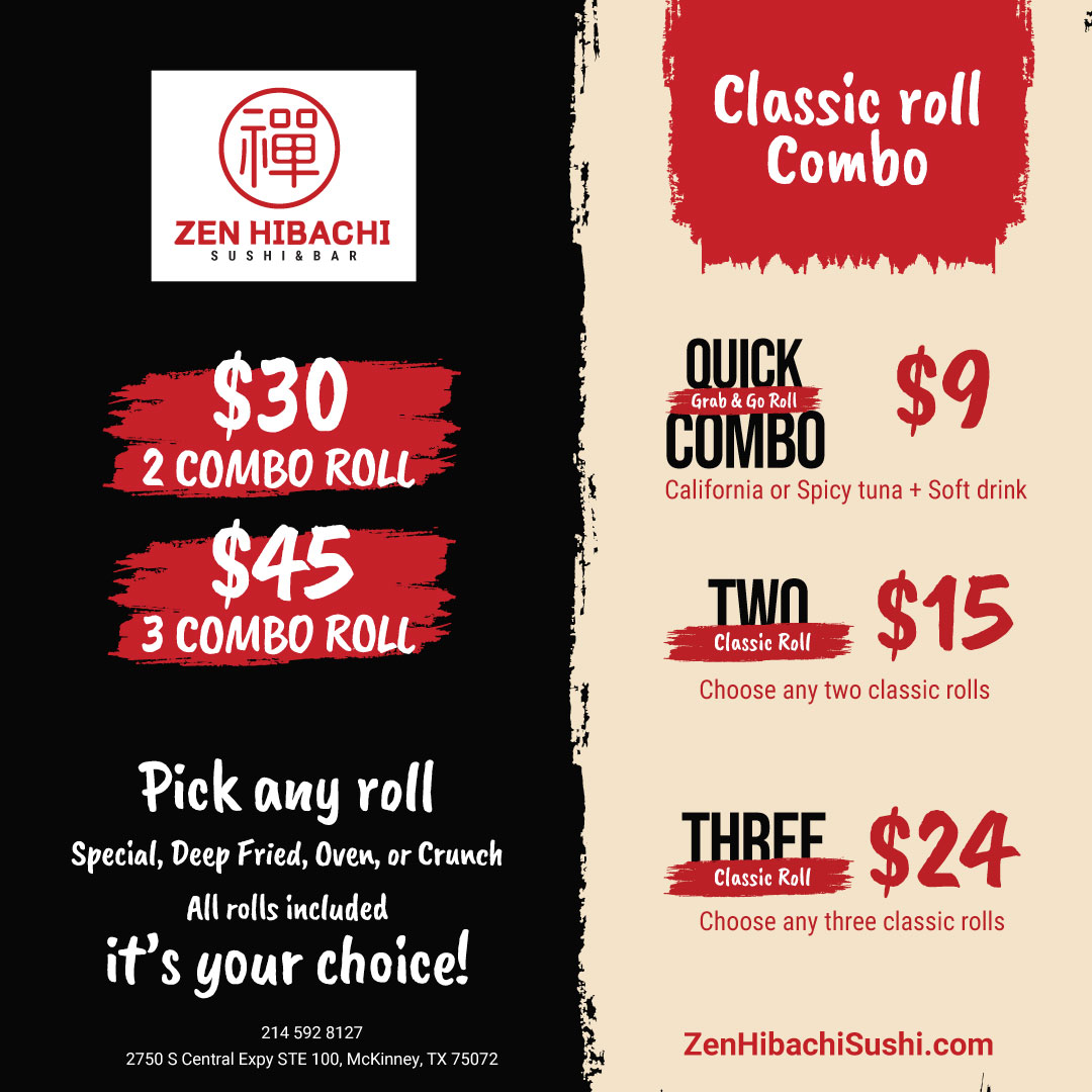 Welcome to Zen Hibachi & Sushi, a delightful Japanese restaurant located in McKinney, TX. This culinary haven features an impressive menu that showcases the artistry of sushi and hibachi cuisine. Renowned for its delectable deep-fried rolls, each creation bursts with flavor, including the standout Golden Tiger Fried Roll and the citrus-infused Zen special roll that patrons rave about. The hibachi offerings, such as the Shrimp & Calamari Hibachi Combo, serve up perfectly grilled proteins glazed with savory teriyaki sauce, delivering a harmonious balance of flavors. Customers like Suresh Pandey and Eliana Hall praise its all-you-can-eat sushi option and the impeccable service that enhances the overall dining experience. With a welcoming ambiance and an attentive staff, Zen Hibachi & Sushi is not just a meal, but an experience to cherish.
